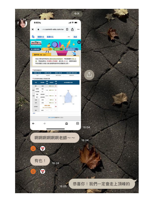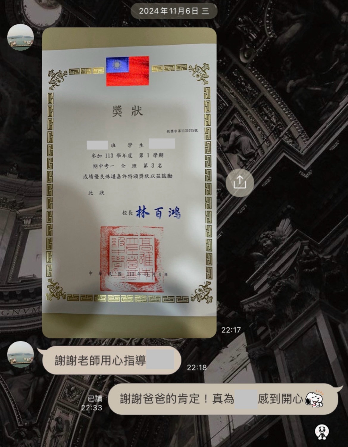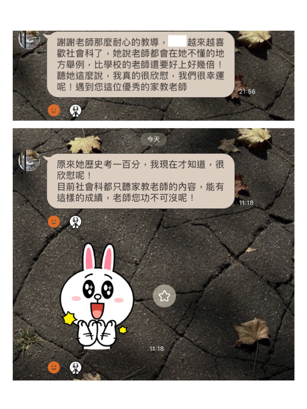 上你的課後的大考,兩次段考都拿了96,這對非常不擅背的我而言,進步太多了。最顯著的是三模,本來我對歷史的基本概念非常模糊,但是在妳幫助我反覆背誦後,最後拿到A,原來考1~4冊的社會是使我最苦惱的惡夢,但是妳講解過後,架構開始清晰,我覺得非常欣慰~